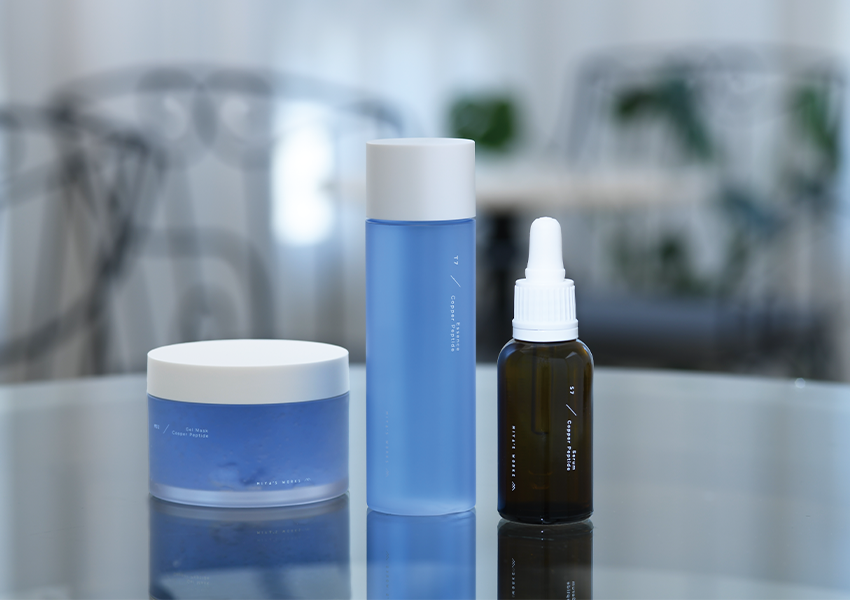 まずは、洗顔後の肌を整える“導入”の役割を果たす「銅ペプチドジェルマスク」で、毛穴をケアしながら肌にハリと水分をチャージ。そして、高濃度な美容成分を肌に届ける「銅ペプチドエッセンスローション」。最後に、肌悩みを集中的にケアしてくれる「銅ペプチドセラム」の3ステップで完了。