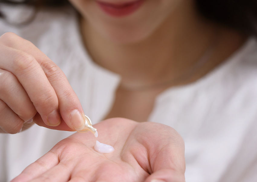 使い方は極めて簡単で、朝晩の洗顔後、カプセルの先端をカットして中のエッセンスを手のひらに取り出したら、化粧水または美容液と混ぜて、顔全体に塗布してやさしくマッサージしながら肌になじませるだけ。顔全体にしっかりと吸収させたら、いつも通りのスキンケアをするだけで、弾むようなハリ感としっとりとした保湿感を実感できます。