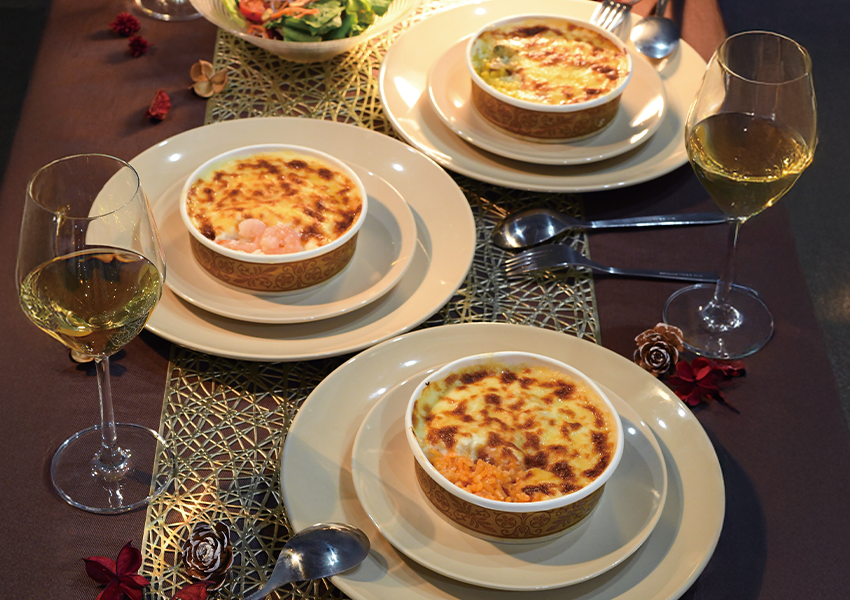 お取り寄せでも店内提供と変わらず、たっぷりのベシャメルソースにこだわりチーズを重ね、特製グラタン皿で焼き上げるこだわりは冷凍グラタンでも健在。