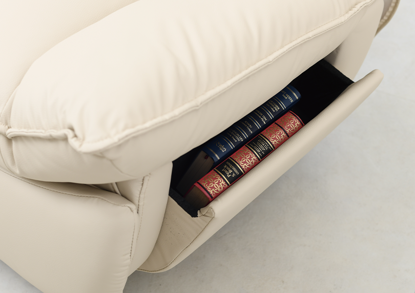 座面のサイド部分には、本や雑誌、ゲームのコントローラーやリモコンなど、立ち上がって取りに行くのが面倒な小物を収納できる引き出し付き。必要なときにはソファに身体を預けた状態のままで取り出せるのがうれしいポイント。