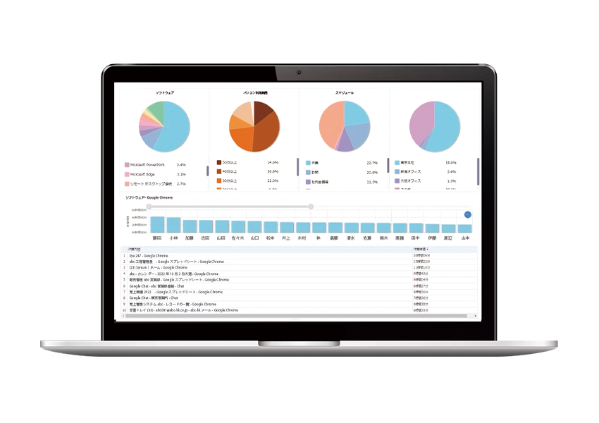 パソコンの端末情報や操作情報を可視化することで、従業員の労働状況の把握やセキュリティ強化ができるクラウドサービス。