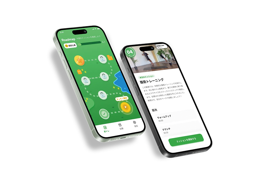 ジムに通うのが難しかったり、家トレを始めても続かないという方々が、楽しく家トレを続けられる仕組みを実現したいという私たちの想いから生まれたのが「できトレ!」です。