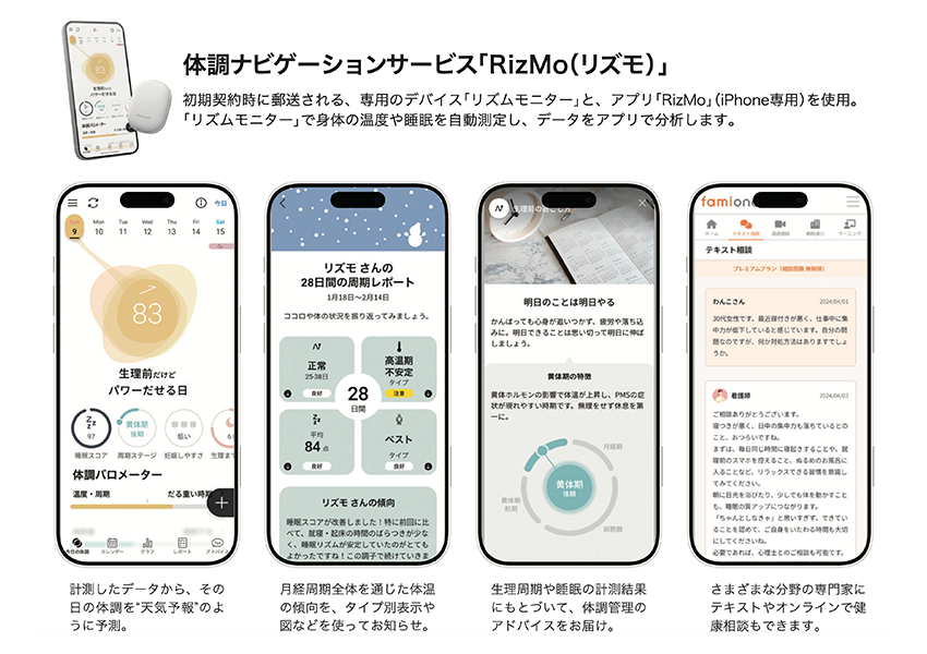 初期契約時に郵送される、専用のデバイス「リズムモニター」と、アプリ「RizMo」(iPhone専用)を使用。「リズムモニター」で身体の温度や睡眠を自動測定し、データをアプリで分析します。