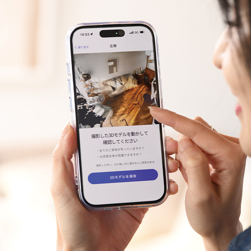 ぐるっと撮影した画像は、自動で3Dモデル化。指で360度動かしたり、ズームもできるので、家財がきちんと認識されているかを確認しましょう。