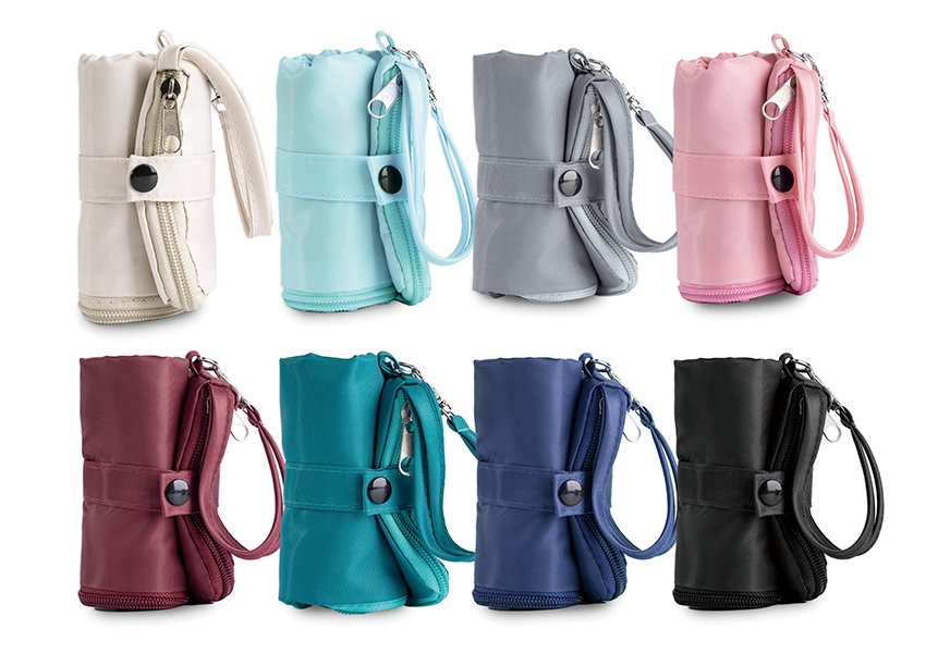濡れた傘をそのまま収納しても雨水が染み出る心配は不要。電車内でもオフィスでも、折り畳み傘をスマートに収納できます。スナップボタン付きとナスカン付きの2パターンのストラップがあるので、フックにかけて収納したり通勤バッグに吊り下げたりも簡単です。