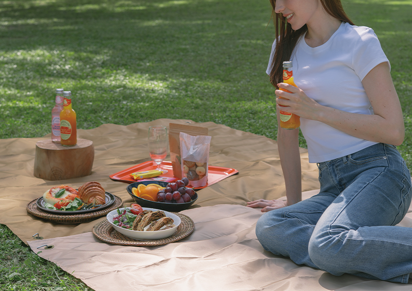 また、景色との色馴染みだけでなく、食事やドリンクとのバランスも良く、置くだけで美味しさを演出してくれるのもうれしいポイント。使用素材の高密度ナイロンは、軽さに加え、砂利や凸凹の地面でも傷付きにくい丈夫さを備え、パラシュート生地にも使用される織り方で破れにくいのも魅力。