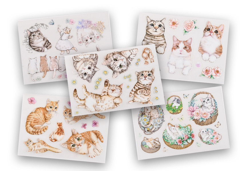 「Cats Daily 転写ステッカー」は、デザイナー自身が飼っている猫や、家族や友人たちが大切に育てている猫たちの日常にある美しい瞬間や、心が和らぐような空想の世界を描いた防水シール。
